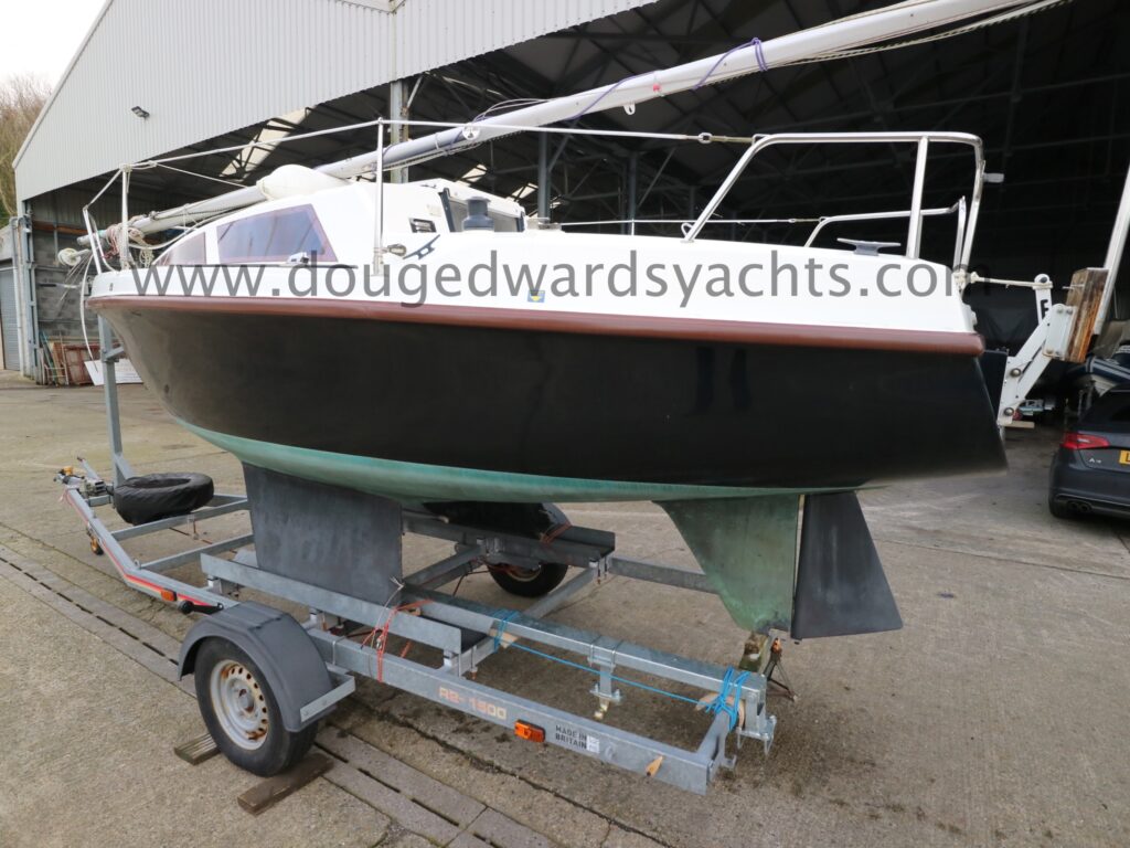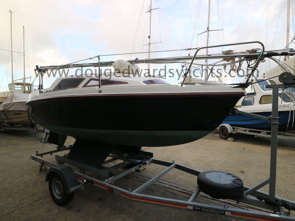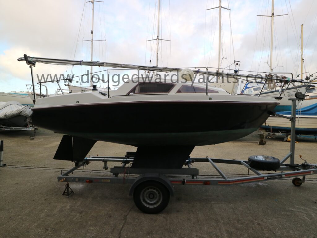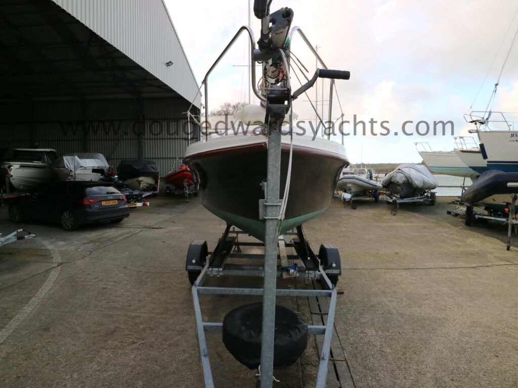 Leisure 17SL (1985 circa) Bilge Keel Sailing Yacht. 4 berths. Mainsail (2019) and furling jib, light airs ghoster. Nasa Target depth sounder. Origo stove. New SBS braked road trailer with mast raising winch, spare wheel, flushing system and slipway launching arm. Recent professional topside respray. Well maintained example. Lying North Wales. UK.
