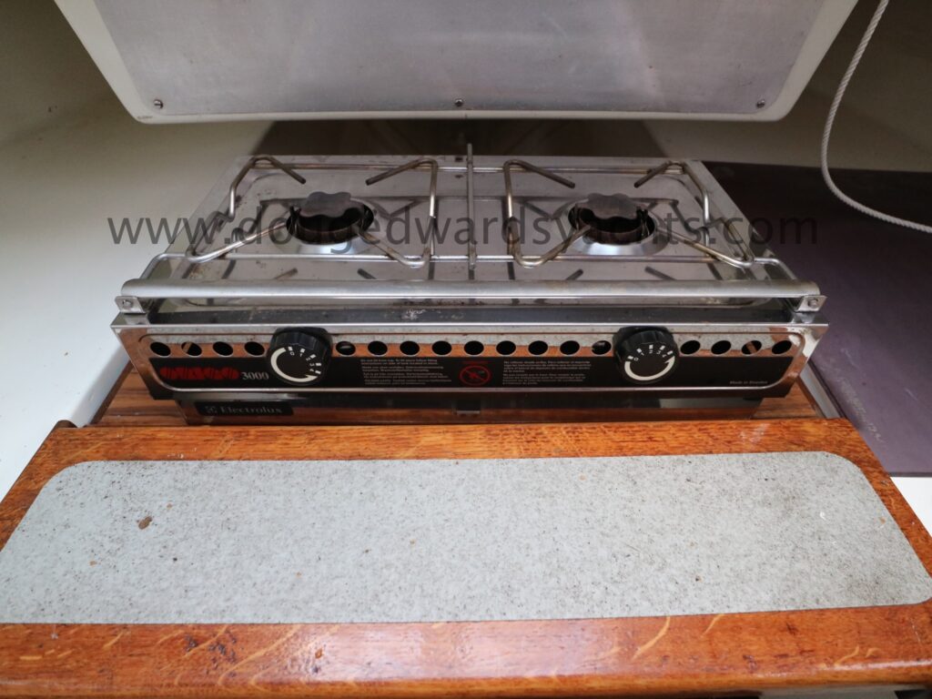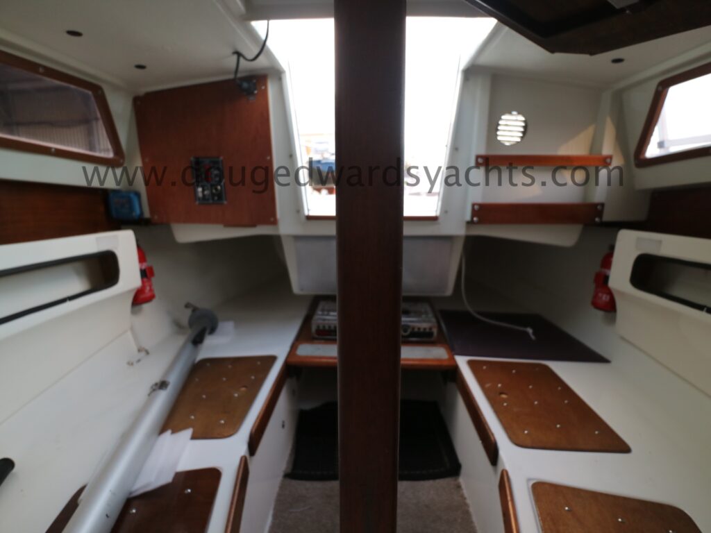 The saloon has seating either side and gives two single berths forward and two single quarter berths aft. There is a dining table that drops down on the mast support. Cabin and cockpit cushions. There is an Origo stove and a Porta Potti.