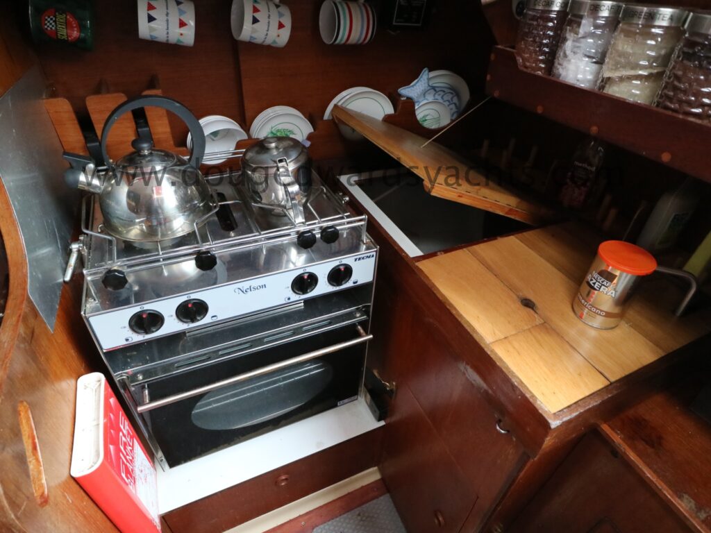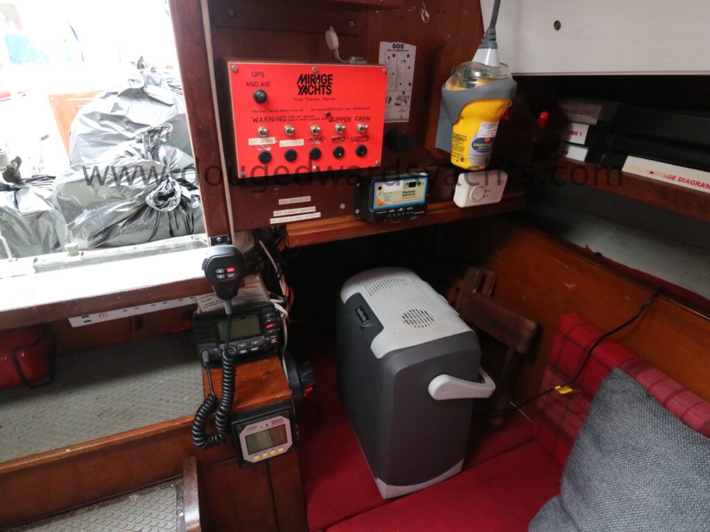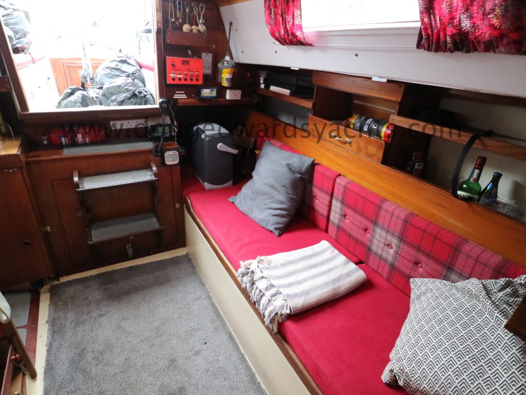 Quality interior joinery all fitted out by Thames Marine. Upholstery renewed in 2013. New headlining and LED cabin lighting in 2021. The forecabin has a double ‘v’ berth. There is a heads compartment with a marine wc (2018, new seacock 2023) to port and hand wash basin above. There is a hanging locker opposite. The saloon has a dinette to port which converts to a double berth. The galley has a Nelson two burner stove (with oven and grill) and a sink with cold fresh water supply. 12v cool box. There is a navigation station to starboard with chart table and VHF.