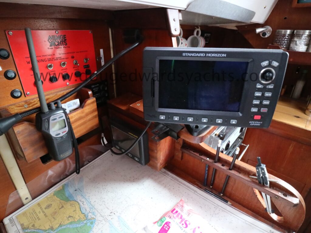 Through bulkhead compass. Standard Horizon CP300 Chartplotter. Nasa Clipper wind instrument (new mast head 2022) and depth instrument (new transducer and display 2025). Nasa Clipper Navtex. Standard Horizon DSC VHF radio. Cobra handheld VHF. Navigation lights.