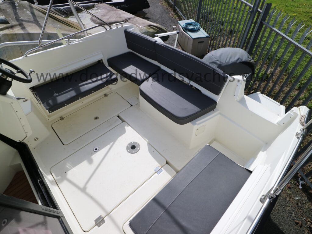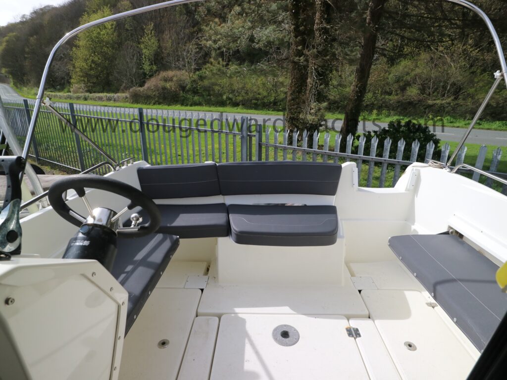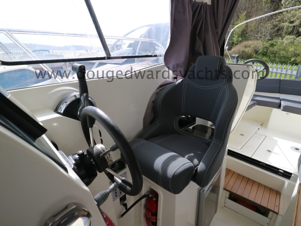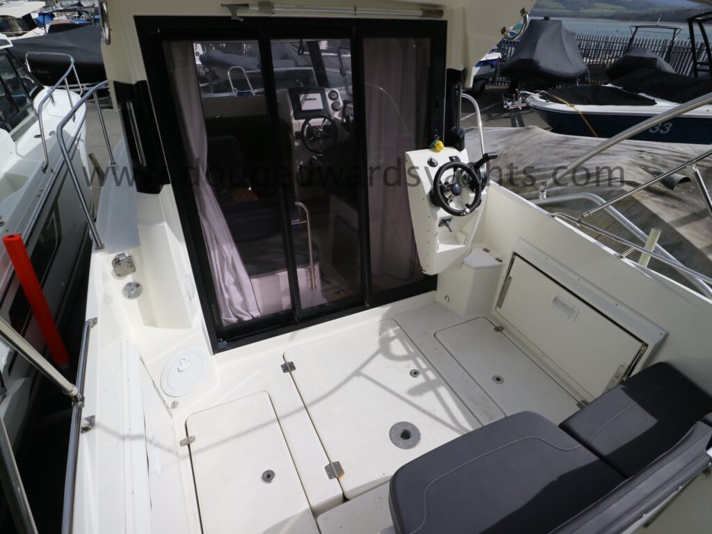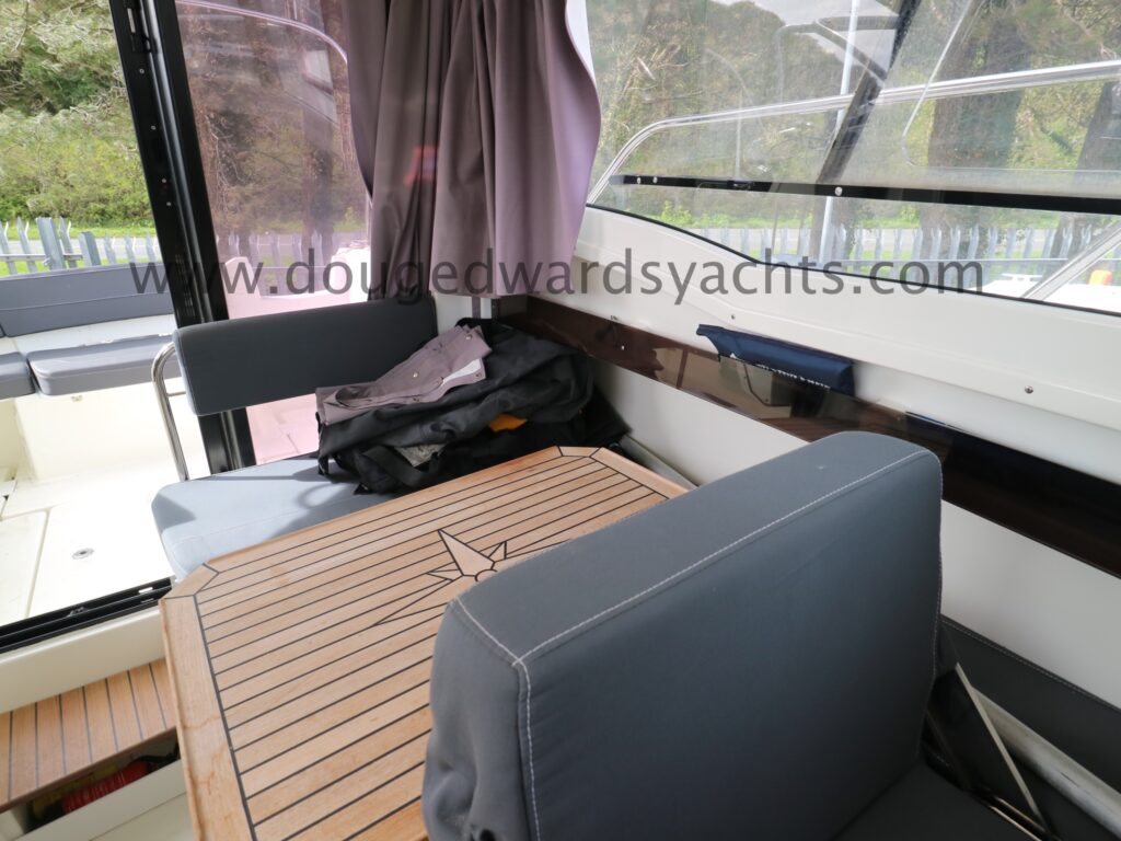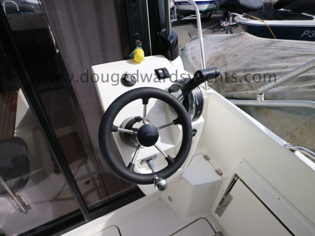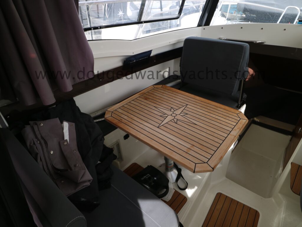 The forepeak has double berth accommodation. There is a private heads compartment to starboard with a marine wc (with 40l holding tank) and wash hand basin. Steps lead up into the saloon/ wheelhouse with a dinette to port which converts into a single berth. The helm is to starboard with engine controls and navigation equipment. The galley has a gas stove, a sink with pressurised cold fresh water supply and a front loading Waeco fridge. Sliding patio doors lead out into the large aft cockpit with access to the bathing platform. Additional helm position in the cockpit. Cabin and wheelhouse curtains. The cockpit has cushions and a dining table a there is also a full canvas cockpit enclosure.
