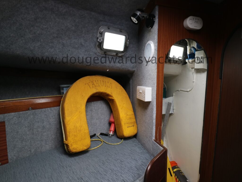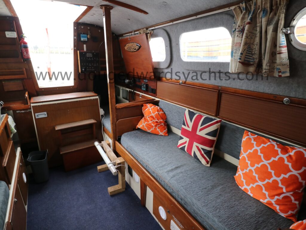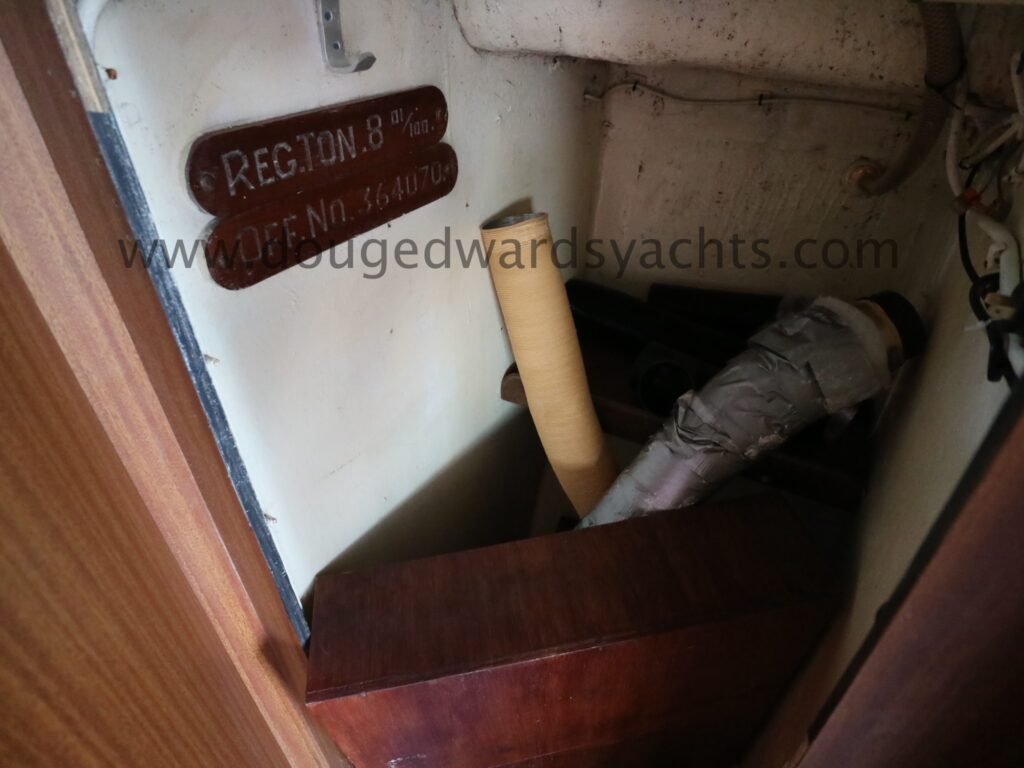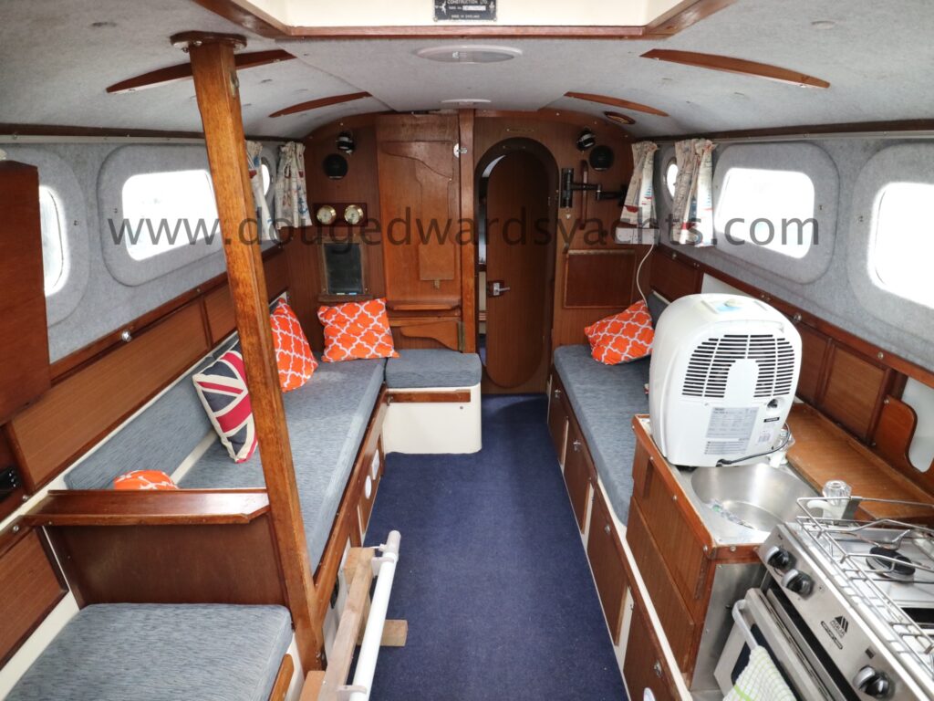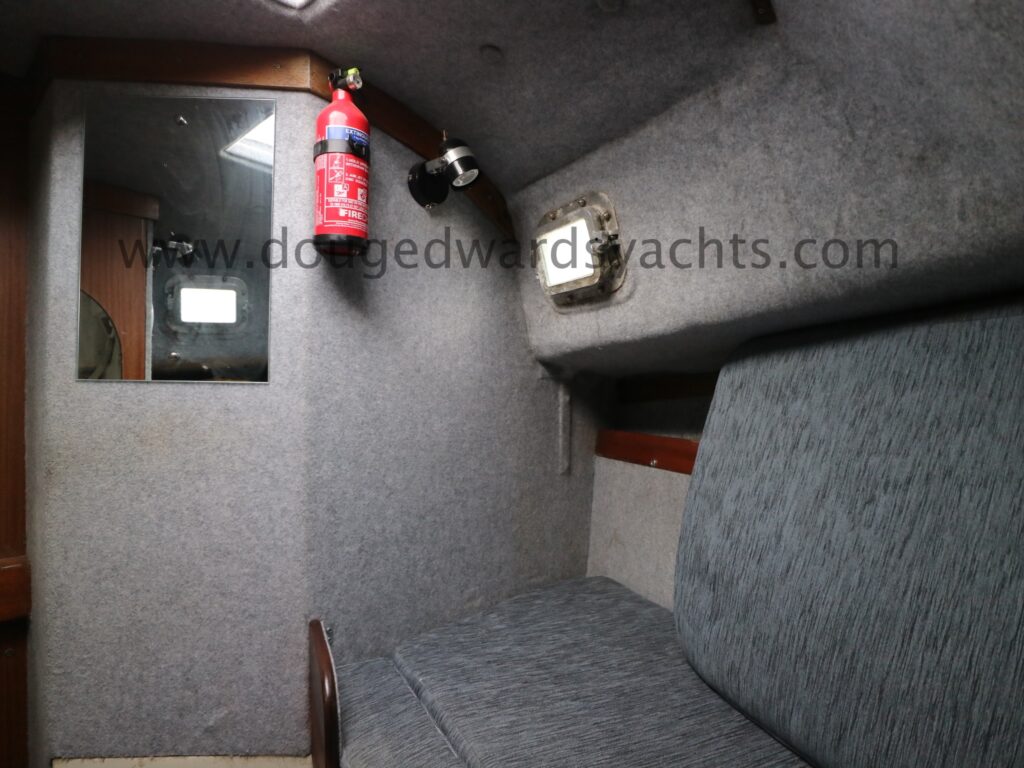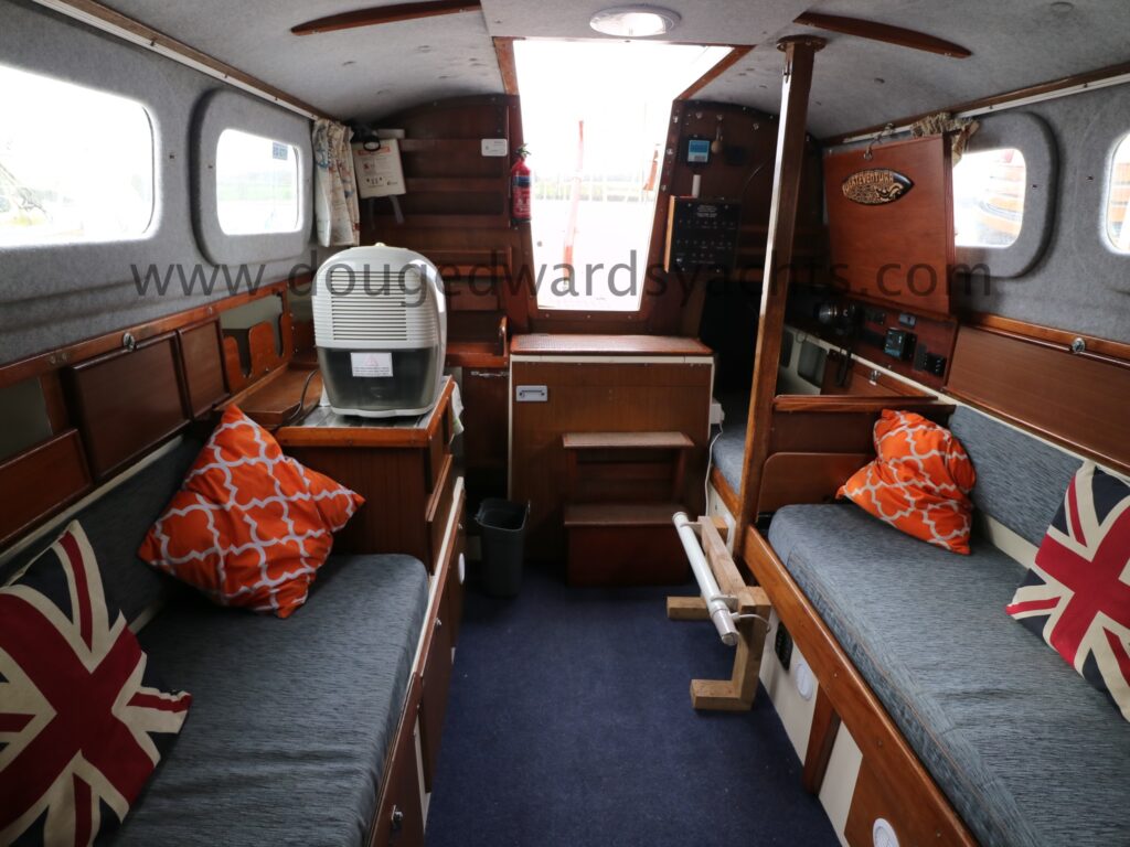 Diesel heater provides hot air heating.The private forecabin has a double ‘V’ berth. There is a marine wc to port and there are two hanging lockers opposite. The saloon has a single/ double settee berth with a dining table and there are two quarter berths aft. The galley has a two burner stove (with oven and grill) and a stainless steel sink with electrically pumped fresh hot/ cold water (new Jabsco pump 2025, hot water calorifier currently disconnected). Pioneer sound system in saloon.