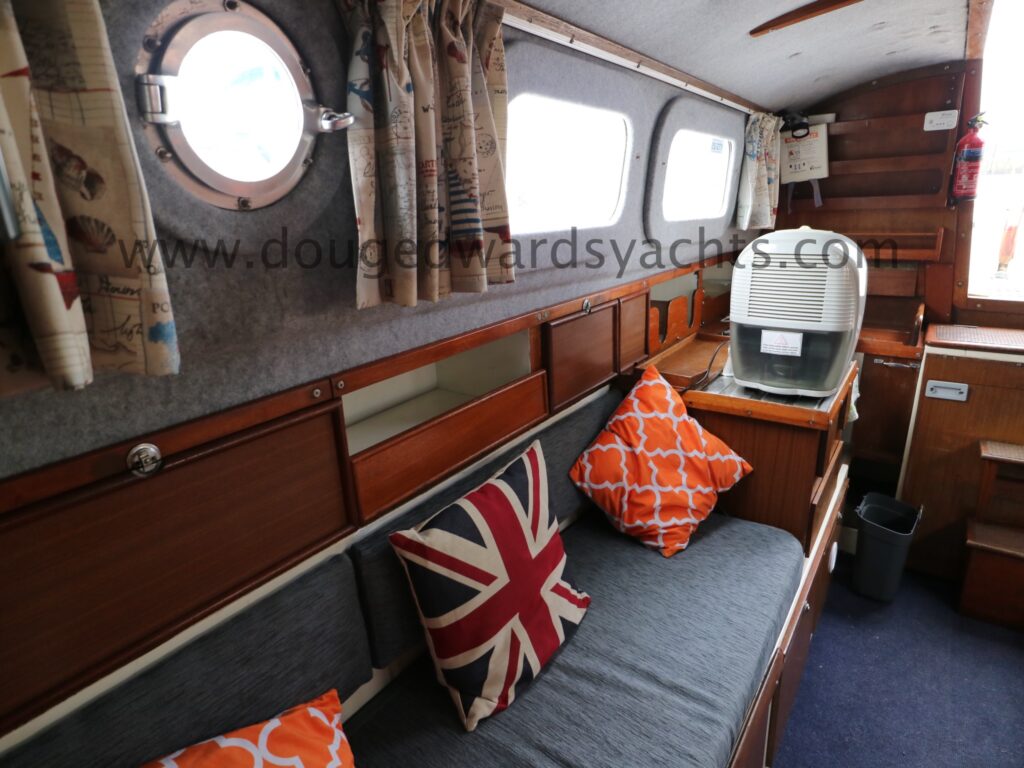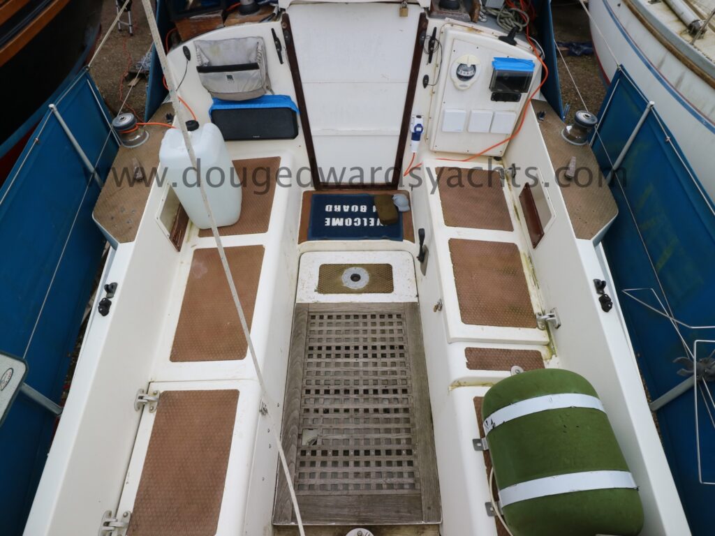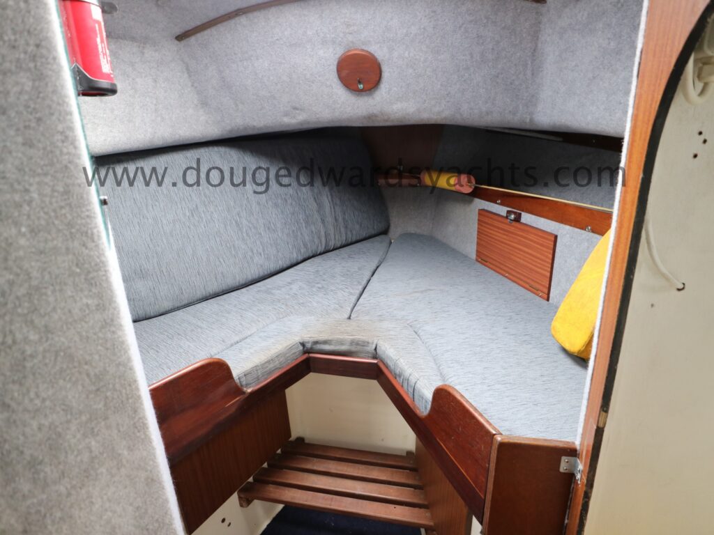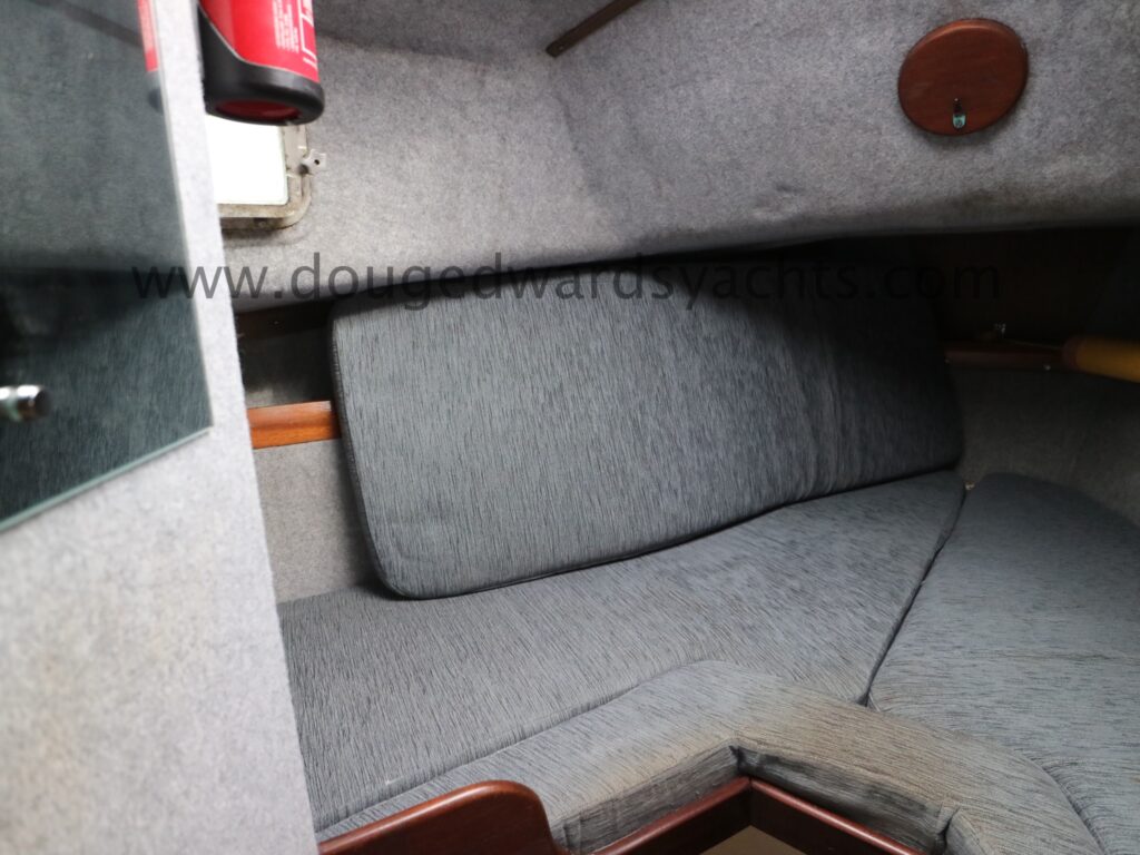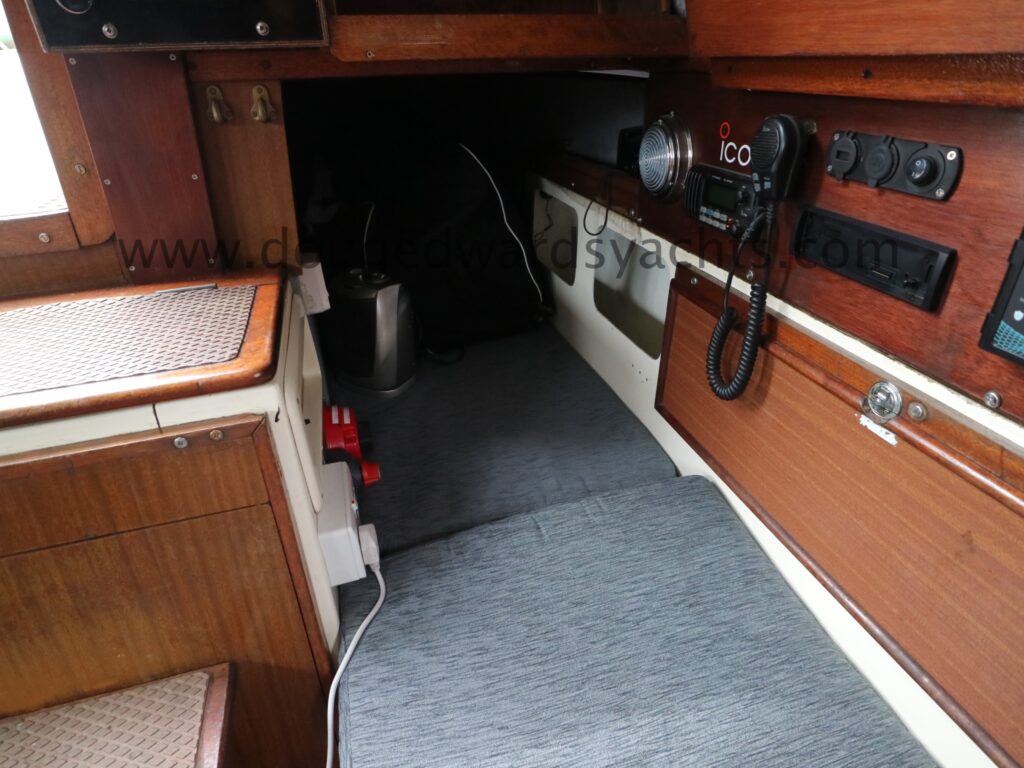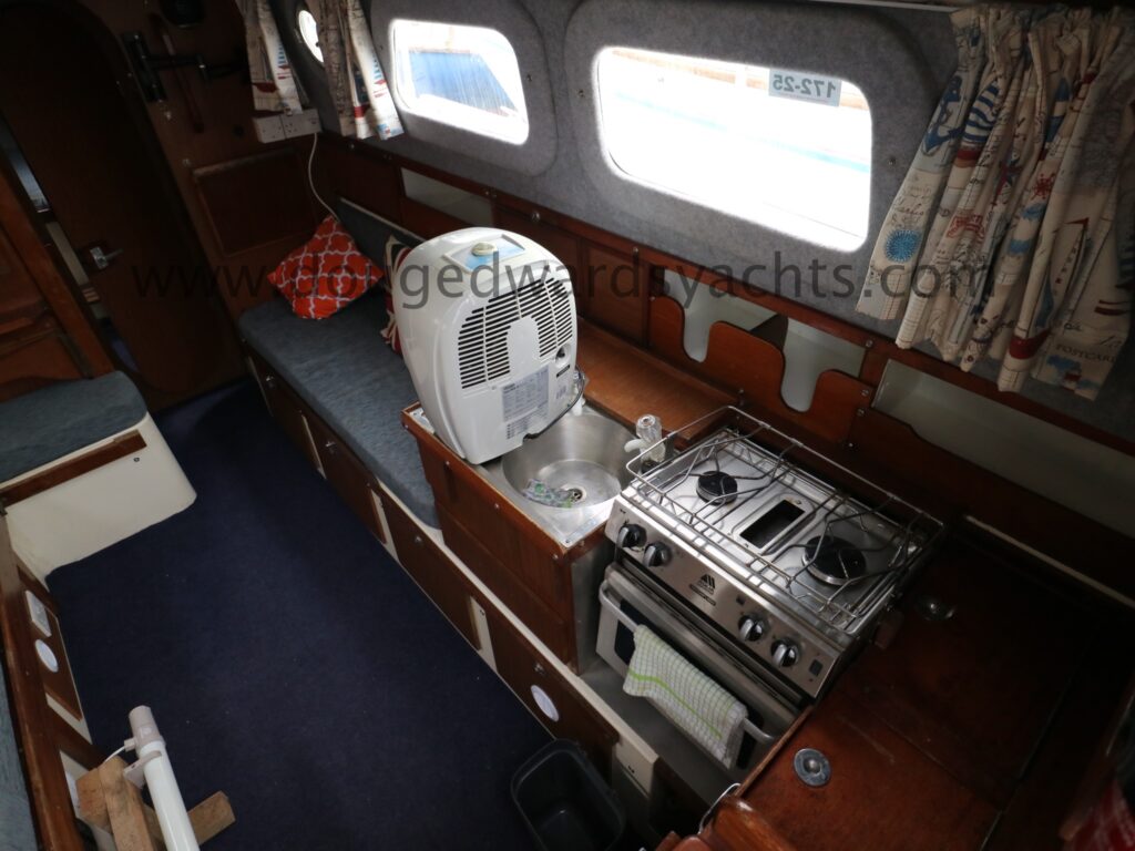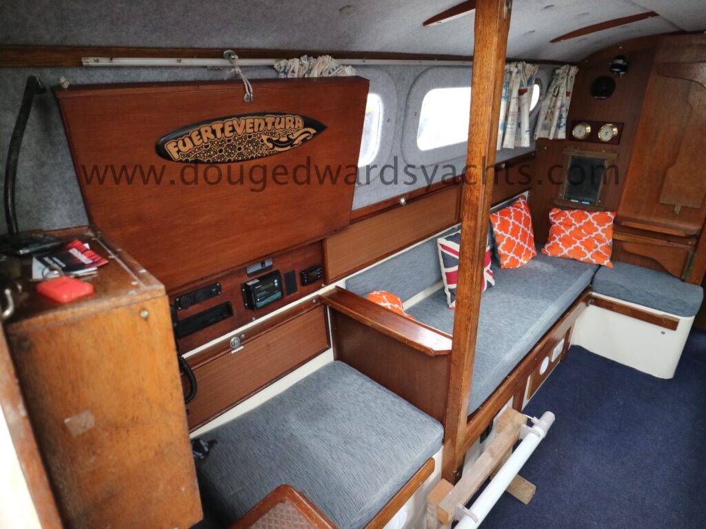Diesel heater provides hot air heating.The private forecabin has a double ‘V’ berth. There is a marine wc to port and there are two hanging lockers opposite. The saloon has a single/ double settee berth with a dining table and there are two quarter berths aft. The galley has a two burner stove (with oven and grill) and a stainless steel sink with electrically pumped fresh hot/ cold water (new Jabsco pump 2025, hot water calorifier currently disconnected). Pioneer sound system in saloon.