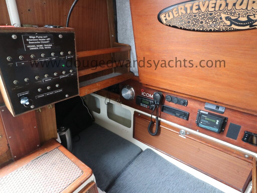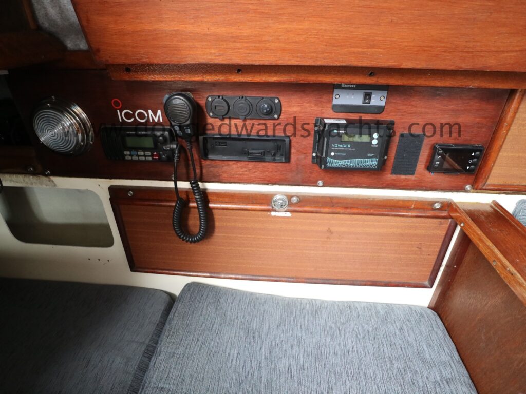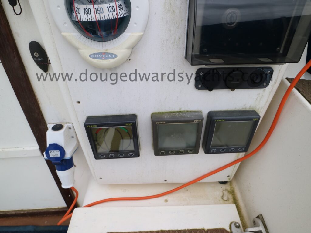 Steering compass. Standard Horizon CP180 GPS chartplotter. Garmin GPS72 handheld radio. Nasa Clipper wind/ log/ depth instruments. Icom IC-M421 DSC VHF radio. Simrad TP22 tiller pilot. Ocean signal AIS Class B. Navigation lights. LED cabin lighting.