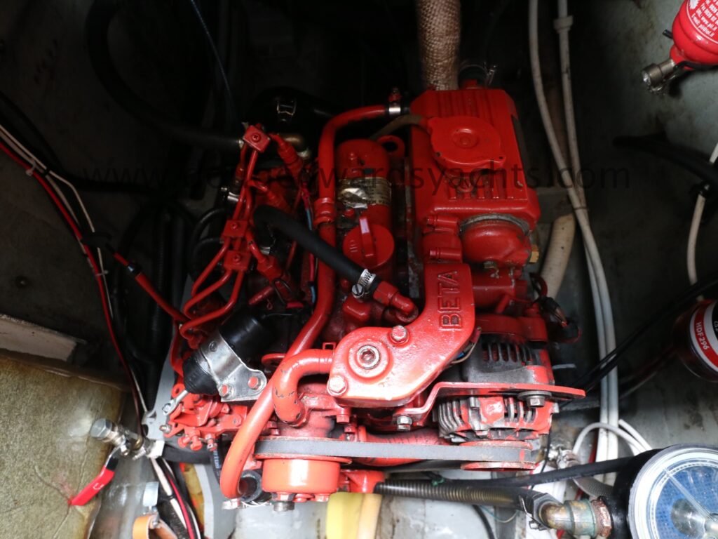 Betamarine 20hp diesel engine (2002) driving three blade propellor via shaft. Engine serviced March 2025. New stern gland 2025. 3x batteries charged by engine alternator. Solar panel charging. Separate shorepower connection with RCD. 1000w Renology Inverter.